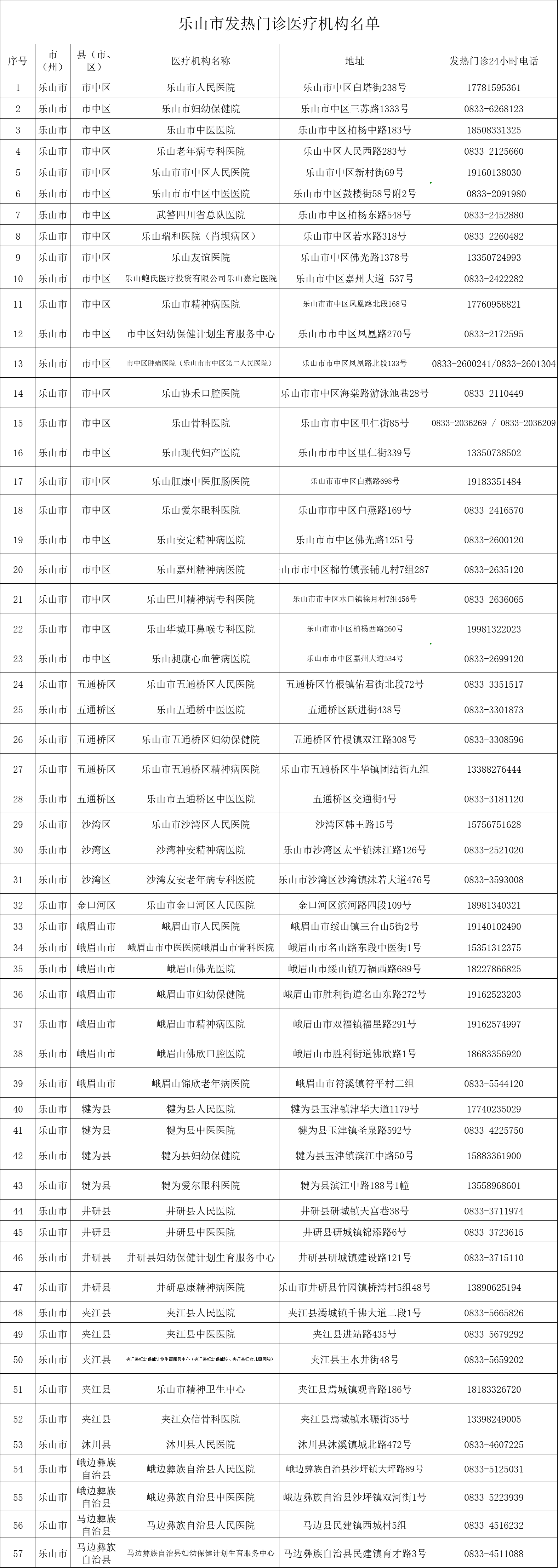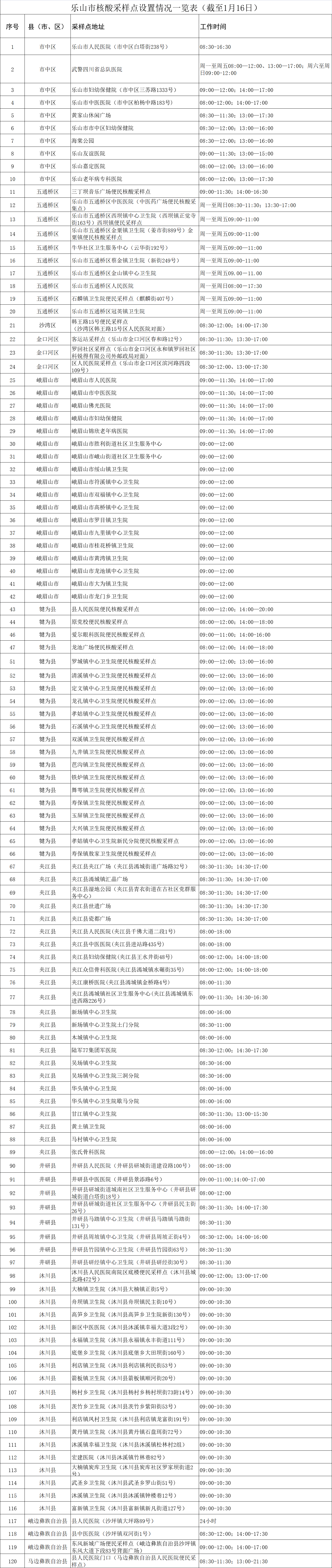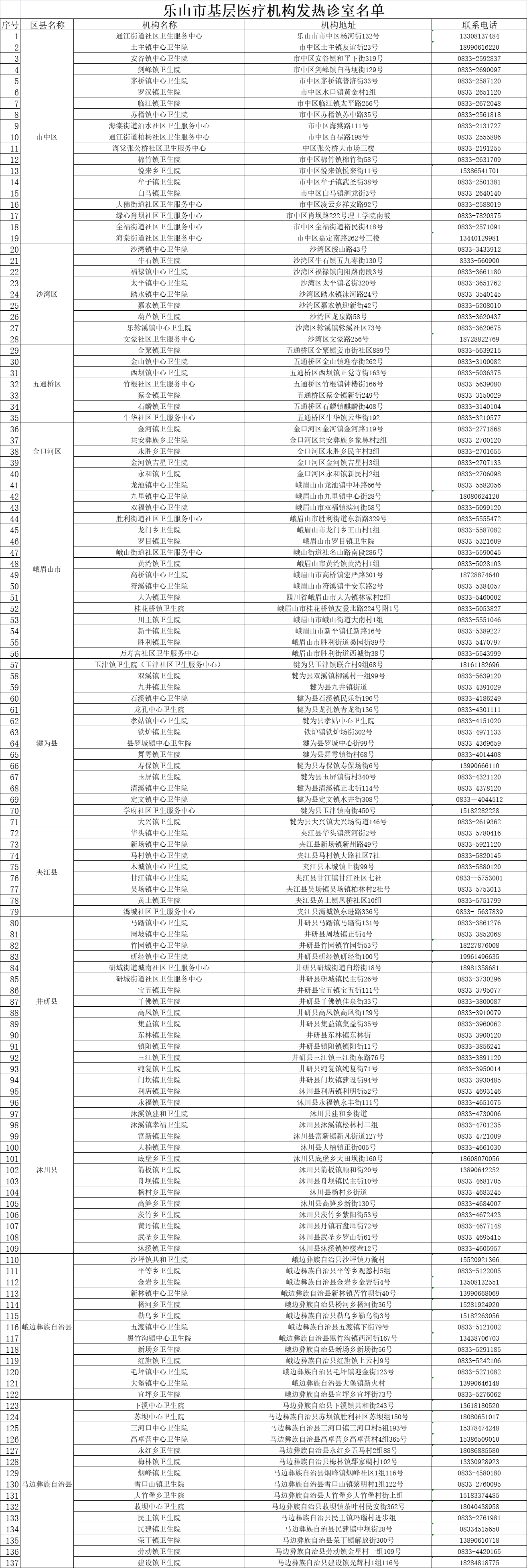 乐山市发热患者就诊机构名单、核酸采样点设置情况一览表(1月16日)